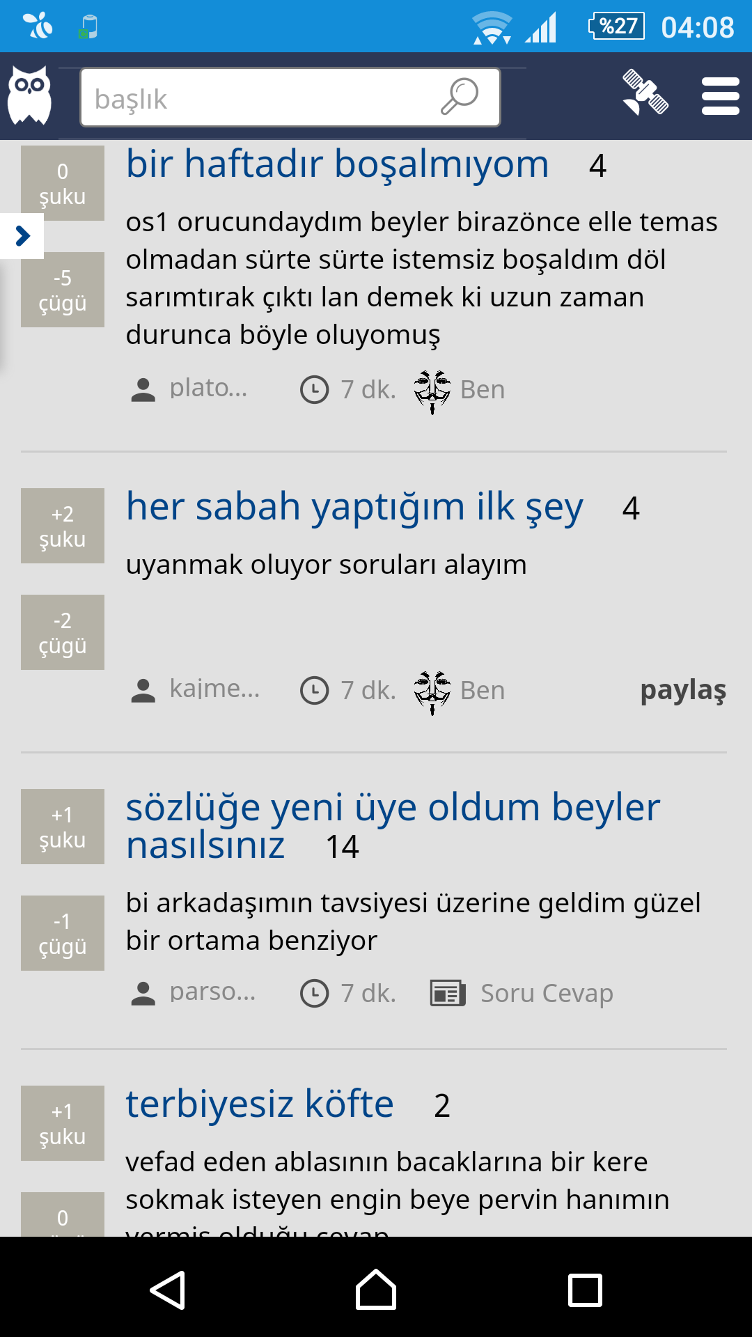 +2Amk şu kayıt işini kapat artık serkan. Alma kimseyi içeri senin yüzünden sözlük kreşe döndü amk binleri yüzünden taşak kokuyo ortalık. Eski yazarların hiçbiri kalmadı. Önceden sözlüğe girdiğim ilk anda basıyodum kahkayı şimdi ağlayasım geliyo. Başlıklara bakınca beynimden vurulmuşa dönüyorum amk.